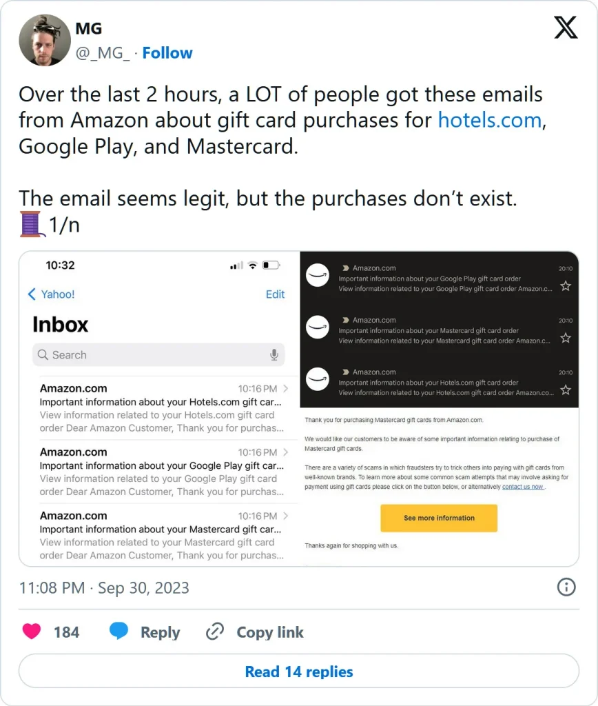 Despite the widespread concern, Amazon remained tight-lipped about the issue until recently. Responding to inquiries, an Amazon spokesperson informed BleepingComputer that the emails were indeed sent in error. The spokesperson stated, “An error in our email system resulted in an order confirmation email being sent to customers who did not purchase a gift card. We have fixed this error to prevent any recurrence and are in the process of contacting all affected customers individually. We sincerely apologize for the inconvenience caused and appreciate the vigilance of our customers in reporting this issue promptly.”