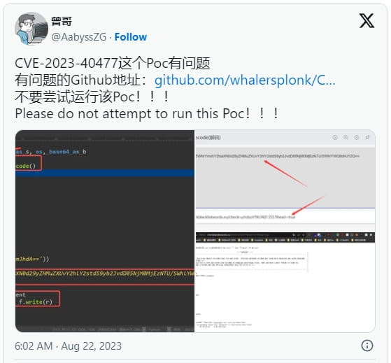The deceptive PoC targets the CVE-2023-40477 vulnerability. This flaw allows for arbitrary code execution when users open a specially engineered RAR file using versions of WinRAR prior to 6.23.